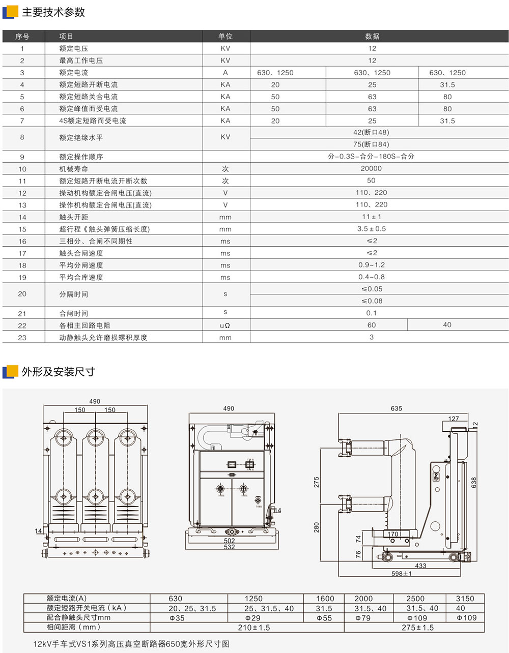 SN63(VS1)-12(650mm)户内高压真空断路器(小型化)