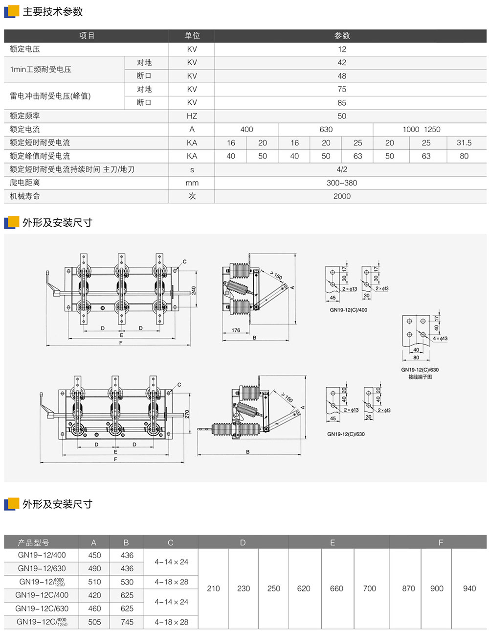 GN19-12型户内高压隔离开关系高压开关设备,用于额定电压12KV,交流50Hz及以下电力系统中,配用CS6-1型人力操作机构,作为在有电压而无负载的情况下,分合电路之用,亦有派生产品防污型高原型的和加装带电显示装置等。