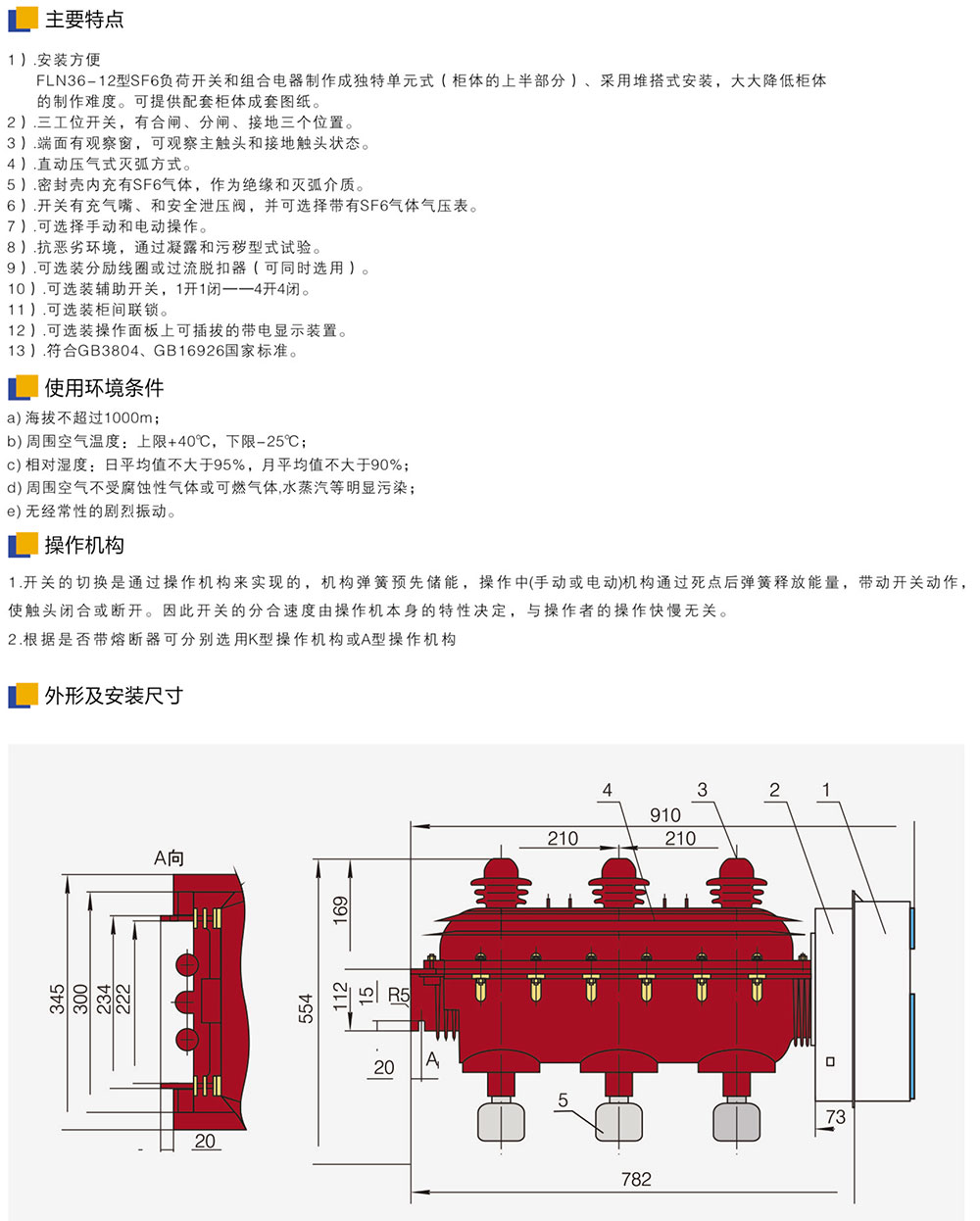 FLN36-12型六氟化硫负荷开关是集负荷开关,接地开关,隔离开关于一体的多功能中压开关设备,在一个全密封的,具有加强结构的环氧树脂外壳内,充以0.045Mpa的SF6气体,用最少的元件实现以上三种功能,因而保证了产品的质量及可靠性,具有极佳的绝缘和开断能力,正常条件下可保证设备安全运行20年。